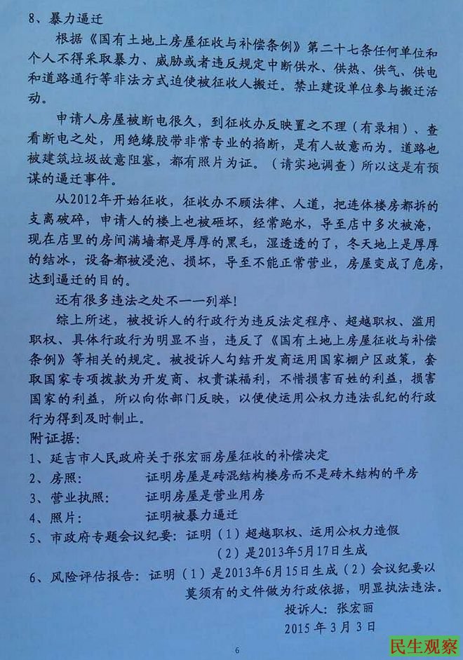 民生观察工作室2016/5/3消息:张宏丽是吉林省延吉市公园街居民,近日她向工作室投诉,公园街一带已有六百多户居民的房子被拆了,现在还有数十户居民拒绝搬迁,当地法院声称明天就来强拆她家的房子。