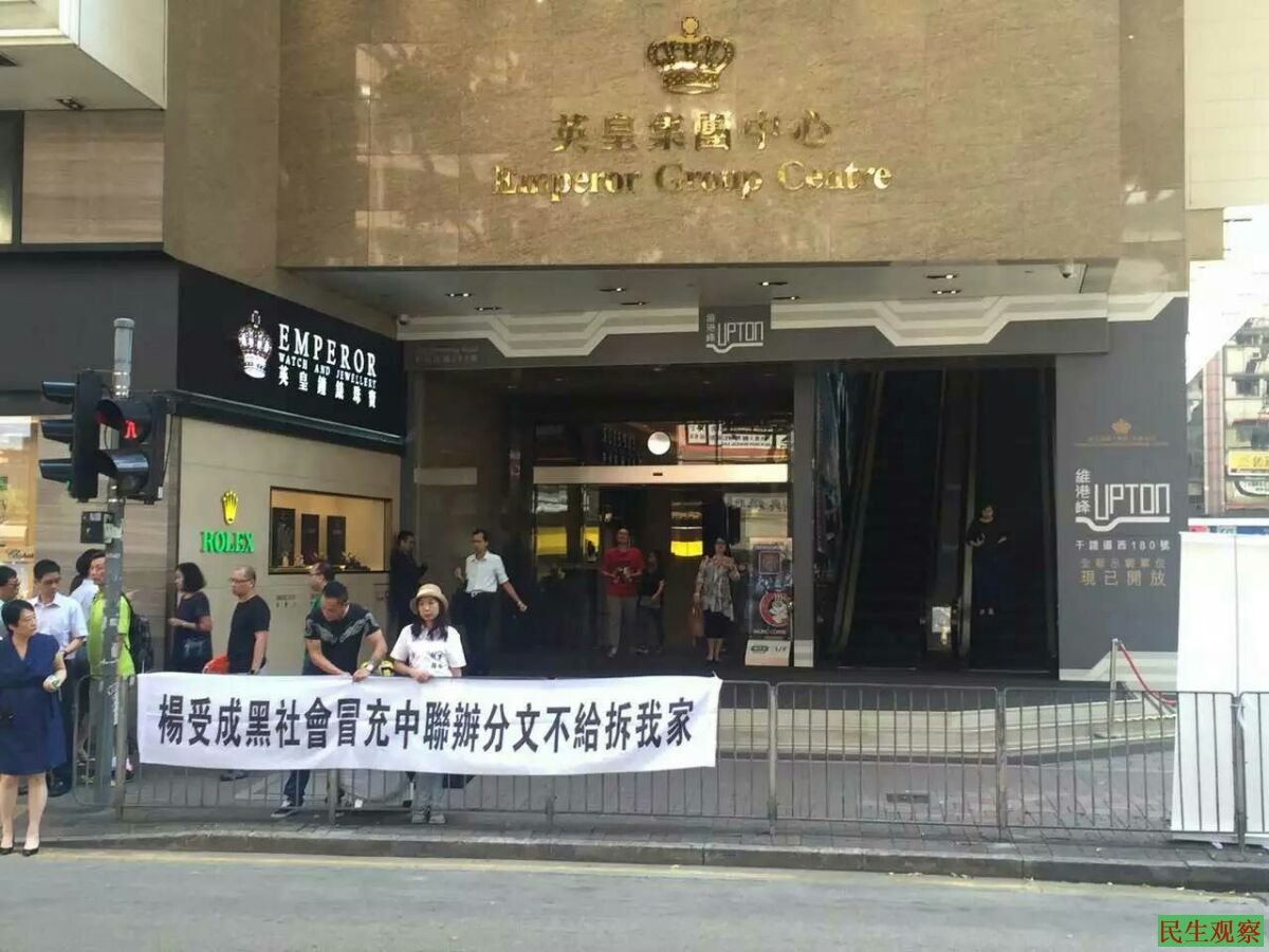 9月21日下午陈燕华在香港告诉民生观察网,她今天是第二次来到香港英皇公司门口拉横幅抗议,横幅内容为“杨受成黑社会冒充中联办分文不给拆我家”,早在去年6月份陈燕华就曾来英皇公司门口拉横幅抗议,当时英皇公司的人趁她去吃饭时把横幅剪断了。