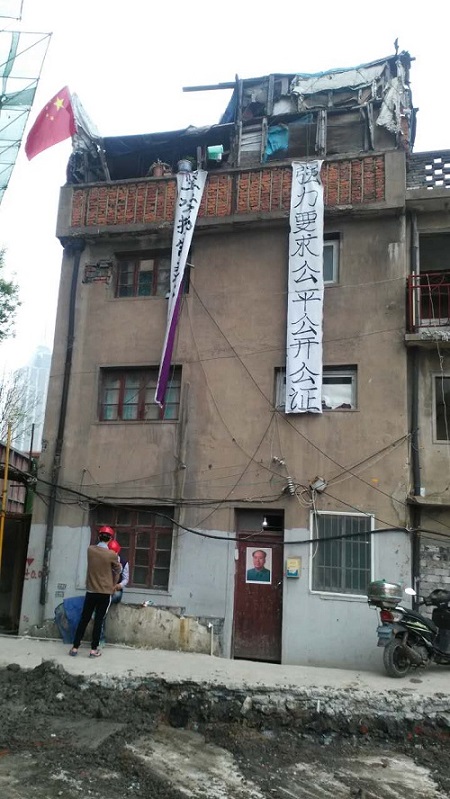 更离谱的是兄弟三个大家庭,动迁只给他们两套住房,周成龙拒绝签约,做了钉子戸,并打出条幅,要求公开、公平、公正!