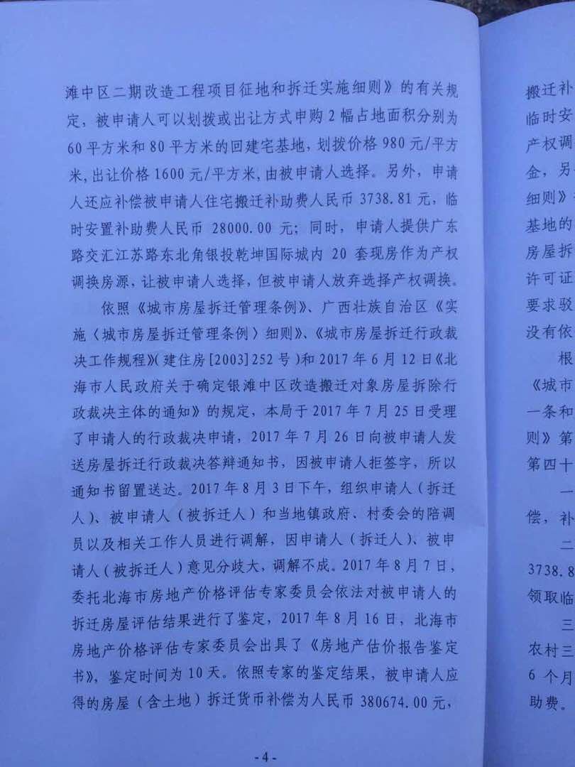 《裁决书》指,被申请人(村民)在收到裁决书后十五天内自动搬出并将房屋交给申请人(拆迁方),如有不服,可以在六十天内向北海市政府或广西住建厅申请行政复议,或在六个月内在北海市银海区法院提起诉讼。