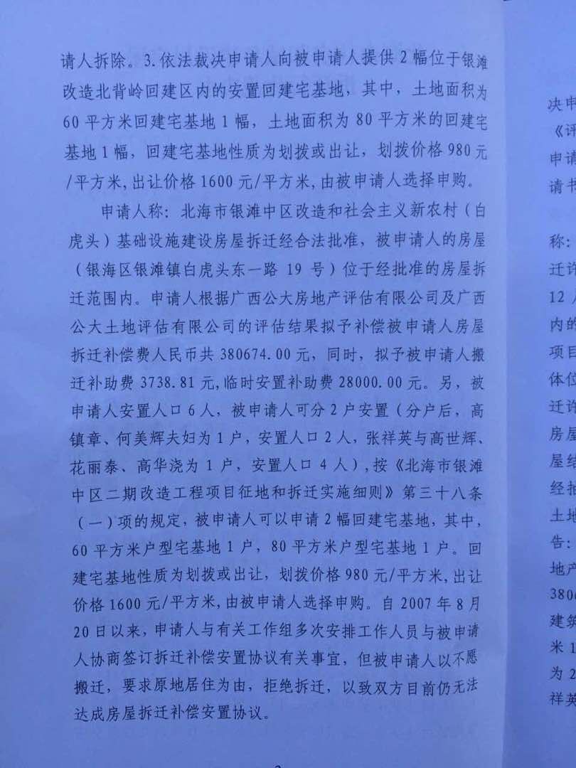 【民生观察2017年8月31日消息】本网获悉,广西北海市银海区银滩镇白虎头村村民高镇章、林瑞兴、林绍玉于昨日(8月30日)下午分别收到北海市住房和城乡建设局发出的《房屋拆迁行政裁决书》,细读之下发觉该裁决书的定价依据竟然来自于2007年时所作的房屋评估报告。