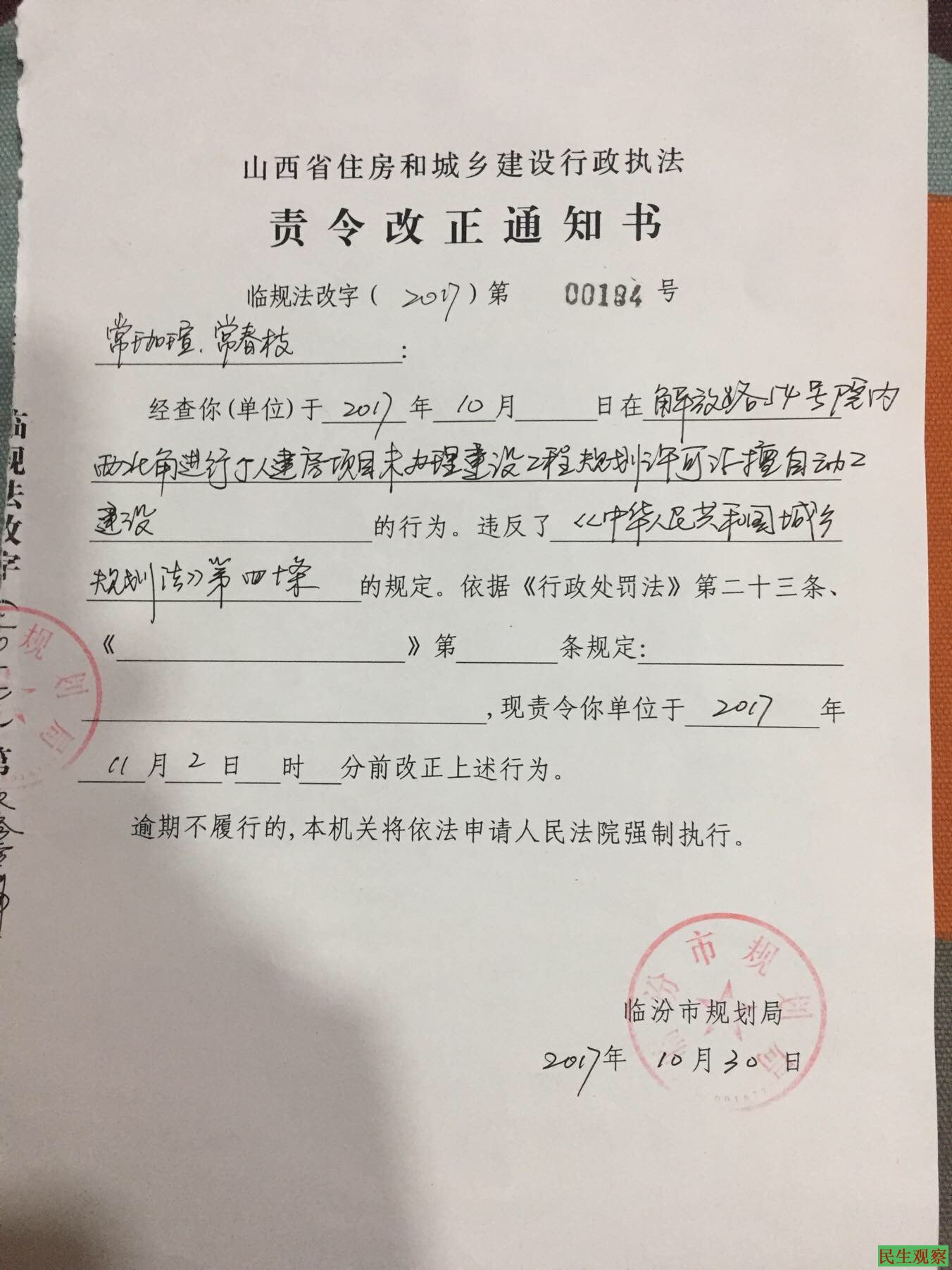 【民生观察2017年11月3日消息】民生人权观察员获悉,山西省临汾市三代维权世家维权人士常珈瑄在自己祖业宅基地造房,遭临汾市规划局人员暴打。据常珈瑄说,所谓规划局的执法者却拿不出执法证,并且着规划局服装却戴着警徽四不像的服装。常珈瑄当场被打的浑身是伤头晕呕吐,现已住院治疗。