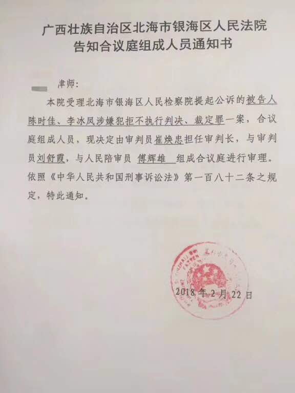 据悉,广西北海市银滩镇白虎头村村民抗强拆夫妇陈时佳、李冰凤自去年(2017年)12月7日被广西当局抓走后,时隔两个多月其子陈刚于本月上周五(2月23日)收到了北海市第一看守所的电话通知,其父母陈时佳、李冰凤“拒绝执行、裁定案件”将于2018年2月27日上午9时,在北海市银海区法院公开审理。与此同时,陈时佳、李冰凤的委托代理律师也收到了来自广西北海市银海法院的《告知合议庭组成人员》的书面通知。