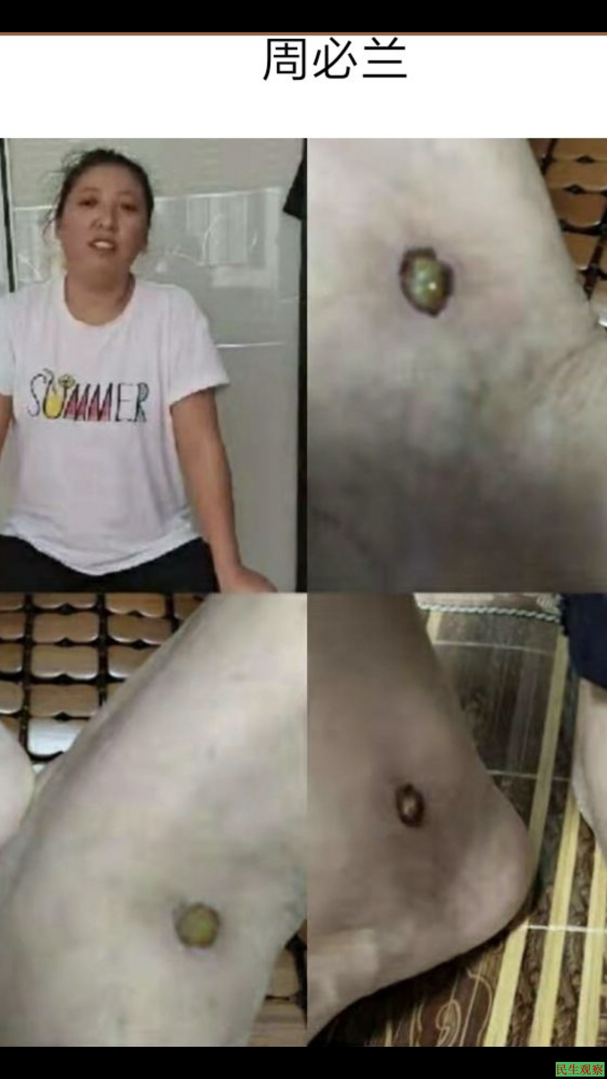 周必兰被铐着手铐脚镣拖拽了约五百米,由于脚镣型号太小,她的脚镣与脚踝摩擦厉害,最后导致其脚踝流血溃烂,至今灌脓不愈。