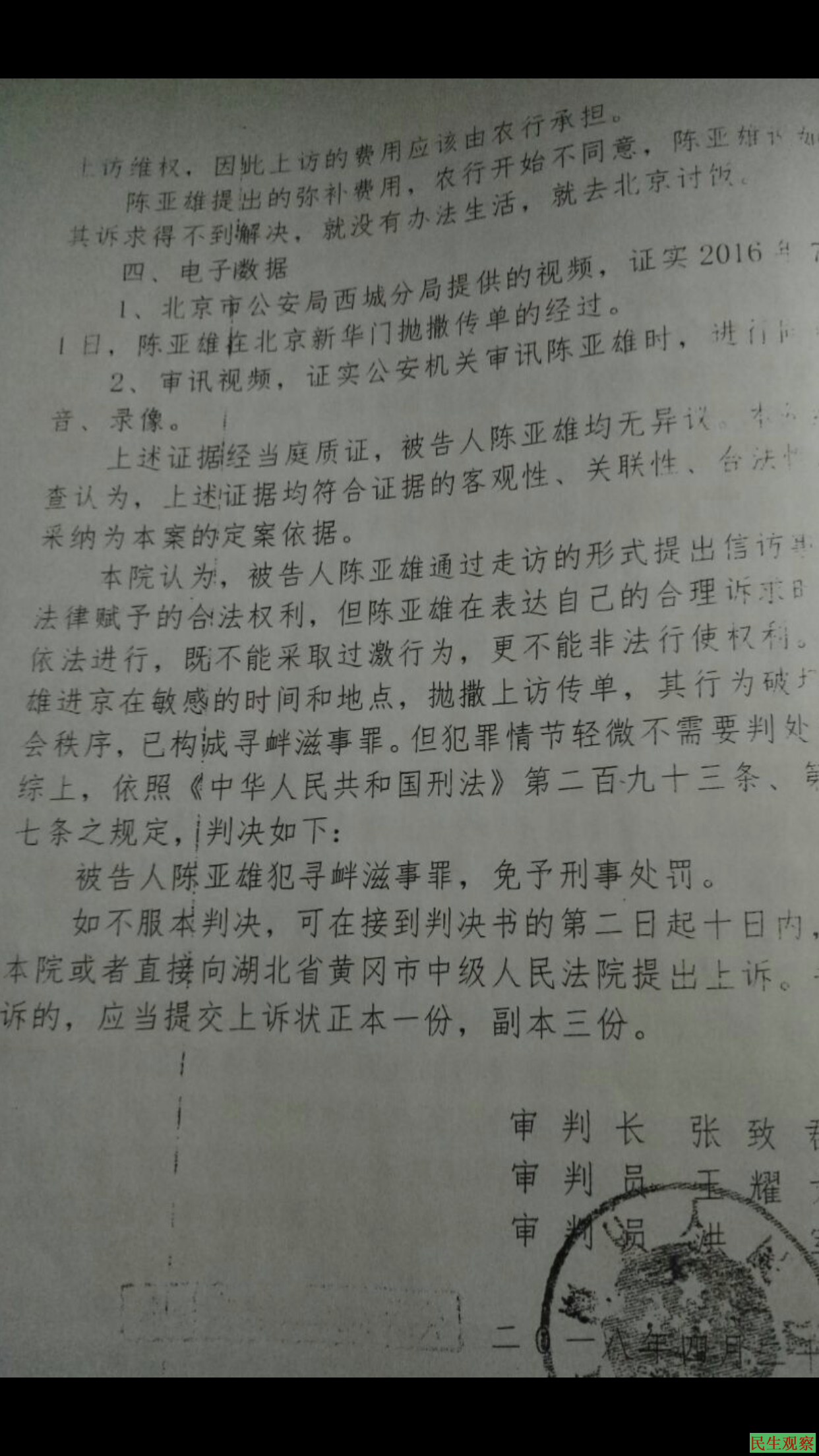 2016年8月30日以寻衅滋事罪刑事拘留597天释放,法院判决并以寻衅滋事罪免予刑事处罚。法院判决不予处罚,但是不给予非法拘留无罪判决。法律文字在他们权力下任意玩弄。