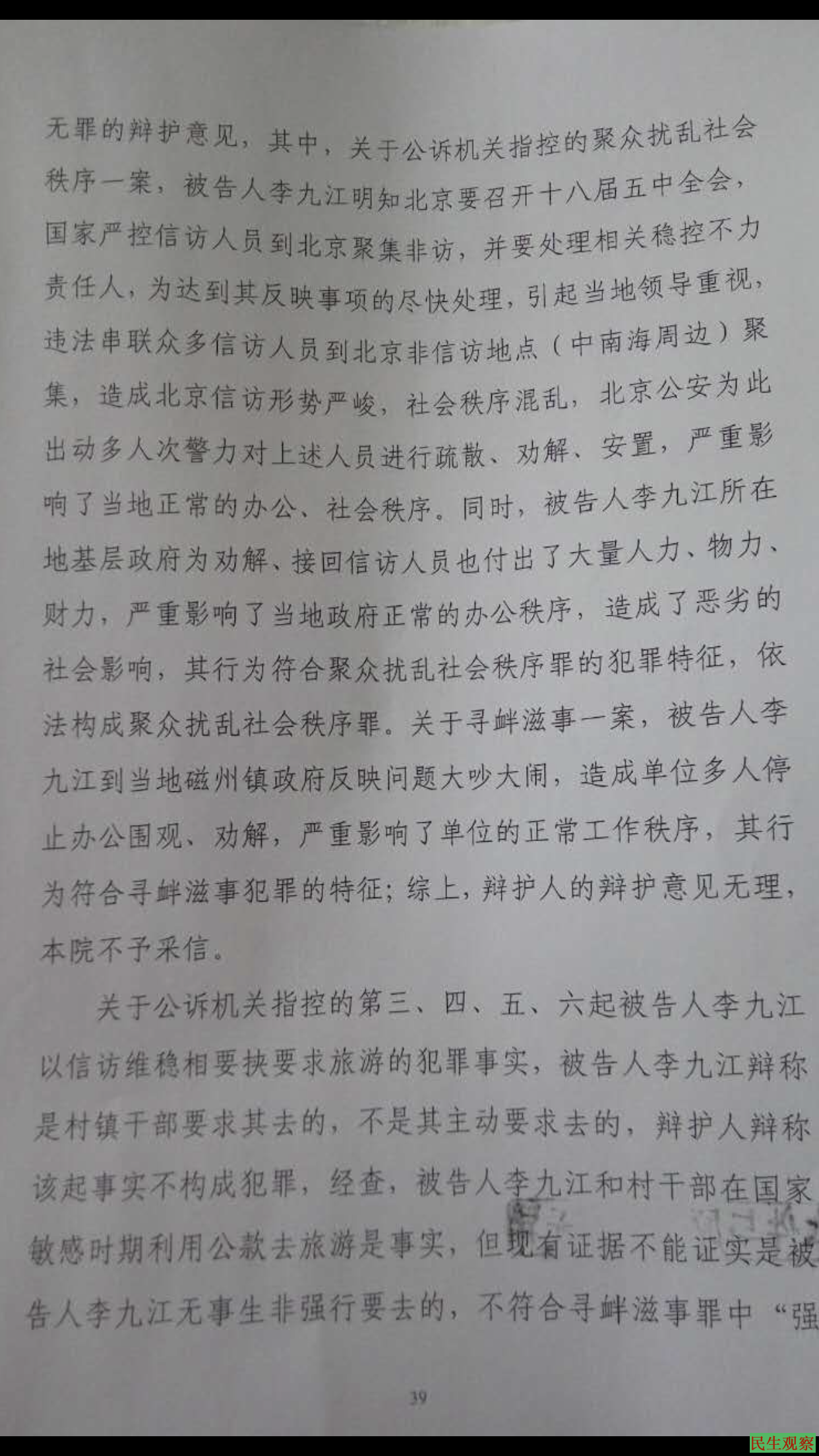河北省邯郸市磁县法院出具的判决书中显示:检察院认定李九江通过电话串联、煽动贾太青、王美兰等人趁北京召开中共十八届五中全会之际,预谋到北京非信访场所中南海周边非访,给磁县政府施加压力,要挟政府解决诉求,并在中共十八届五中全会召开当日到中南海周边非访,形成20多人集体访,威胁镇领导要曝光其不作为,刁难劫访人员等违法行为造成被判刑。