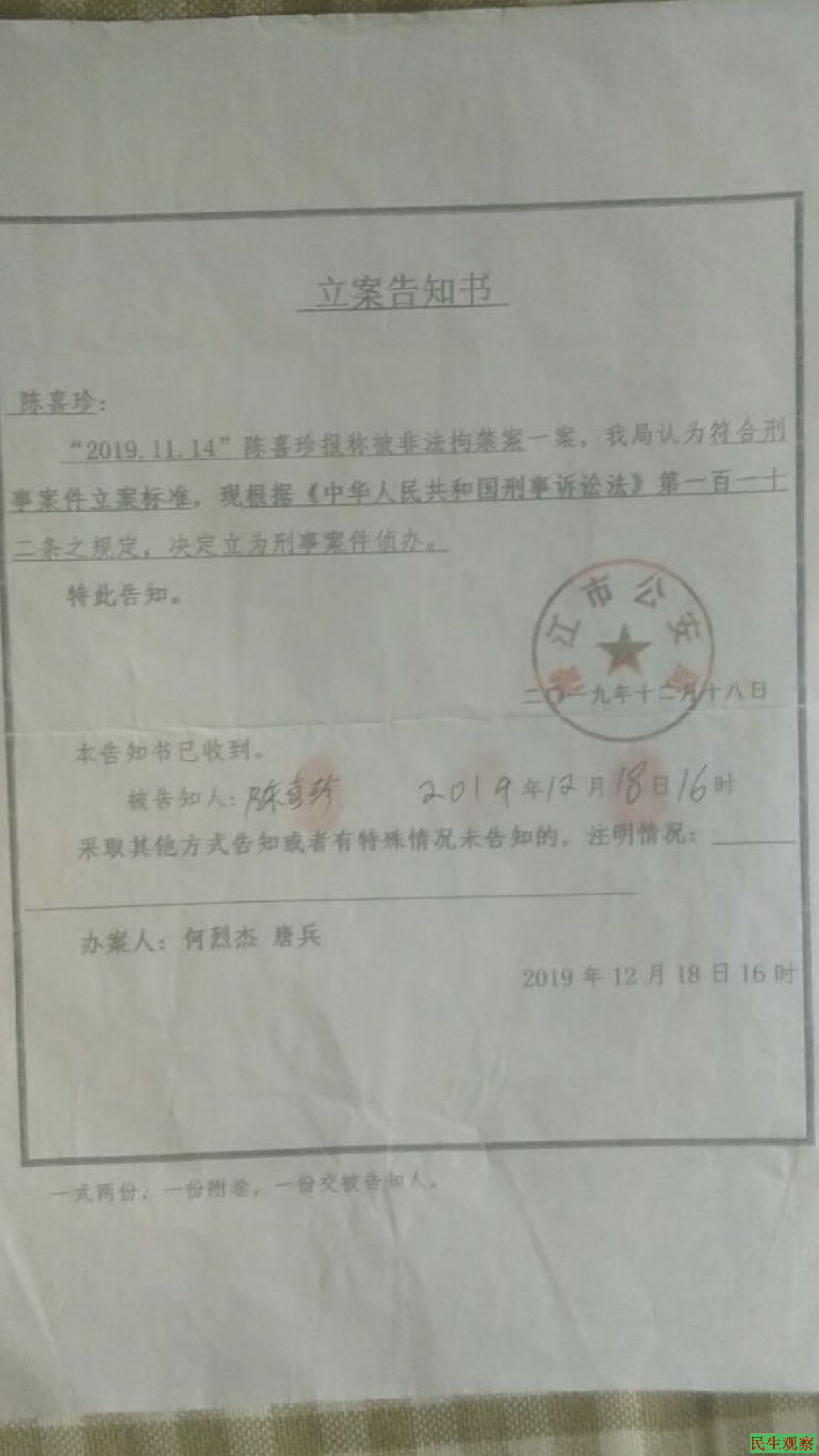 陈喜珍回家后报警报案被绑架关押一事,多次寻找公安局,派出所,信访局,政法委等相关部门都不于解决问题,用各种理由推诿,踢皮球,陈喜珍不断的维权到省信访局,省公安厅等部门,最终在2019年11月14日在潜江公安局立案,从立案至今为止没有结果,