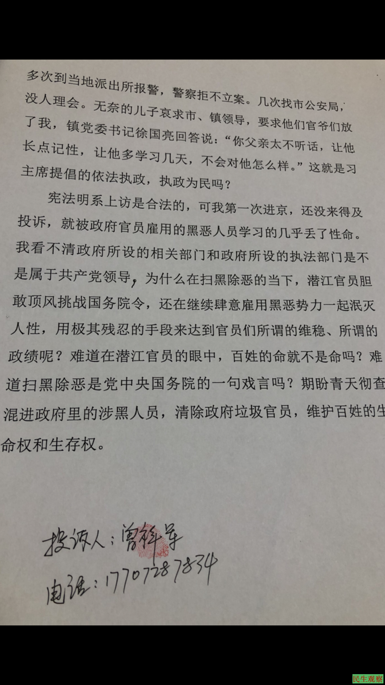 在曾祥军非法关押期间,家里房屋被强拆,家人无数次报警,要求立案侦查,公安拒不立案,多次要求官员释放曾祥军,镇党委书记徐国亮竟然还说:“你父亲不听话,让他多学习几天,不会对他怎么样的,曾祥军是第一次进京还没有来得及去信访局各部门登记就遭到拦截遣返,参入遣返工作人员有警察,有镇副书记,镇党委书记徐国亮等多人参入绑架软禁曾祥军,参入虐待殴打曾祥军的镇党委书记徐国亮,镇副书记,派出所所长等人都是知道的。难道习近平说要把信访工作解决在萌芽状态,就是这样非法软禁,私设黑监狱乱用酷刑虐待折磨访民的吗?难道依法治国就是这样体现出来的吗?。