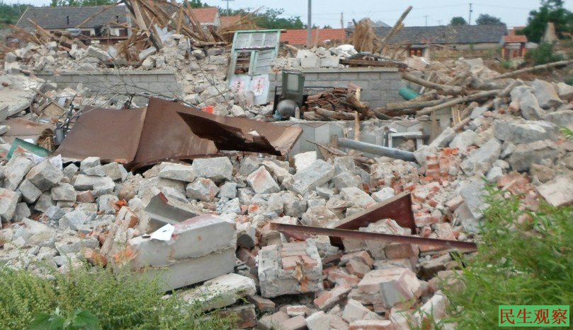 我们正在接受治疗的时候,2013年6月18日晚上8点40分,两辆没挂牌子的黑色轿车和一辆面包车外加一辆装载车上装着一辆大挖掘机,带着二十多个人手持棍棒,围住我家房屋周围,把房子用挖掘机铲平。村里人不敢靠前,我们家中的东西全部被砸毁在里面。接到村人告知,我们赶回,房子早已成为废墟。我们报警多次,警察一直没出警。他们说那是政府行为,他们管不了。