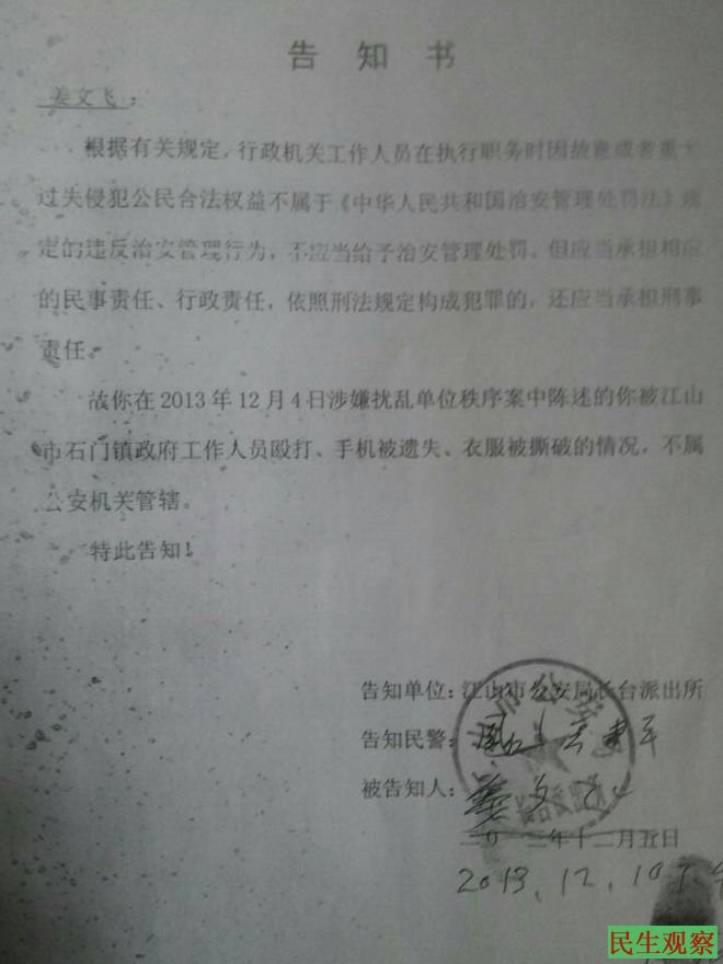 浙江江山一派出所公告行政人员故意违法不应治安处罚