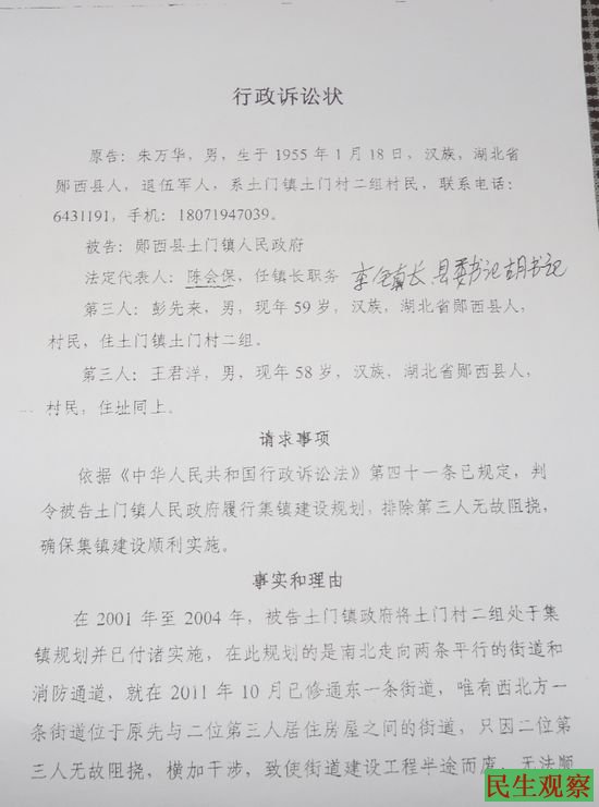 湖北郧西朱万华就出行受阻及土地被占的申诉书