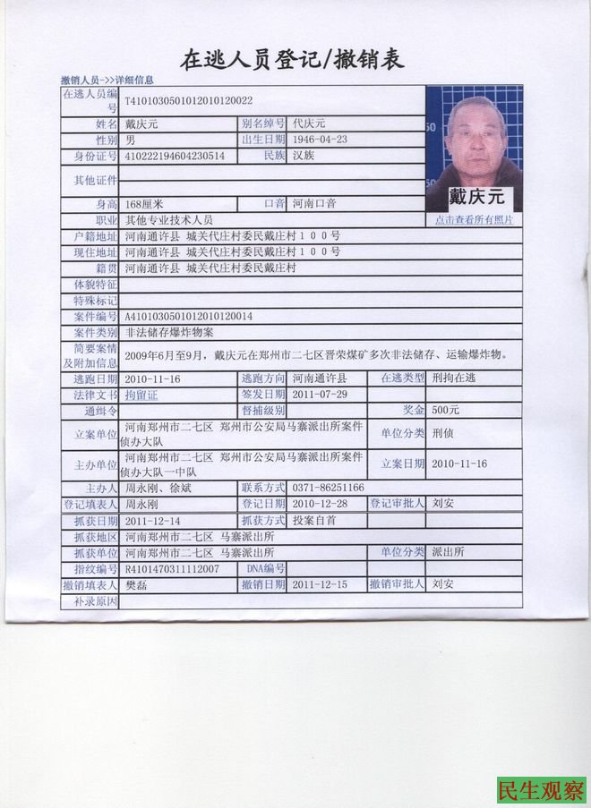 1、2012年2月17日,我矿股东诉中国出版集团公司(今日信息报)名誉侵权一案中,在北京市东城区法院复印证据中发现有戴庆元(见附件2),这时,我们才知道马寨派出所已于2010年11月28日将我父亲戴庆元错误上网通缉达一年之久,我们家属多次到马寨派出所询问情况,至今也没得到马寨派出所的任何书面通知和告知材料。