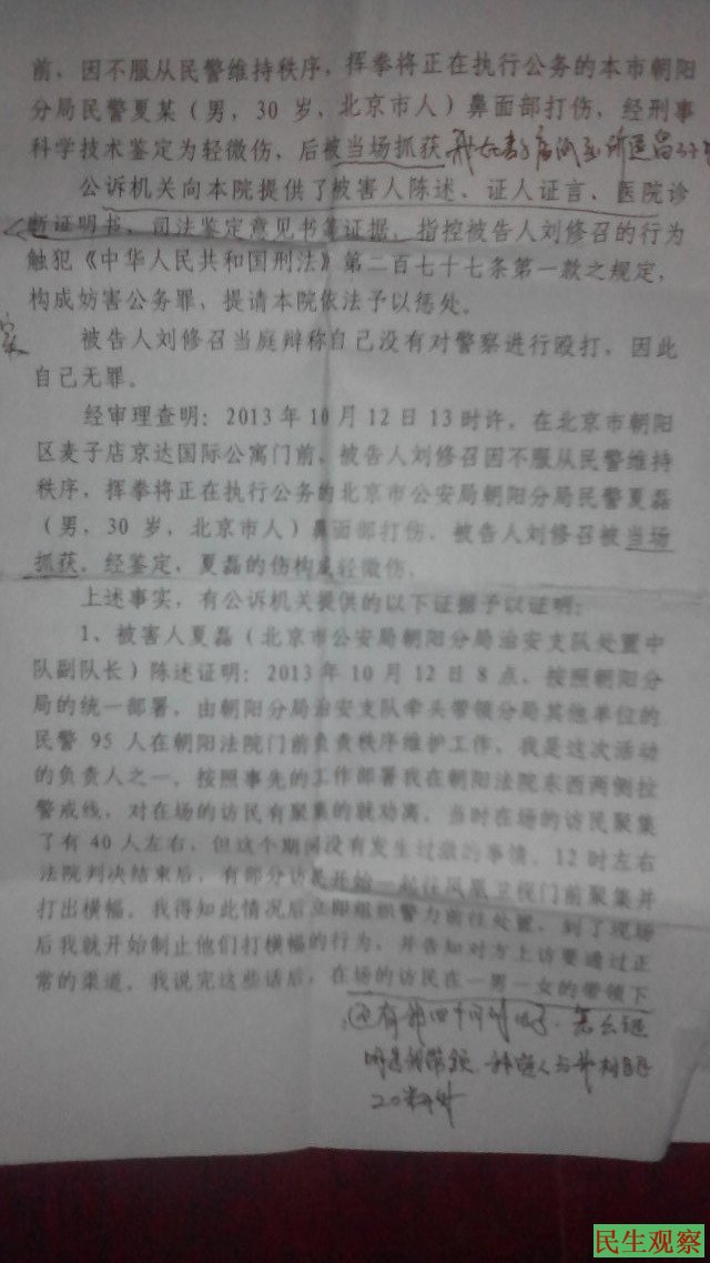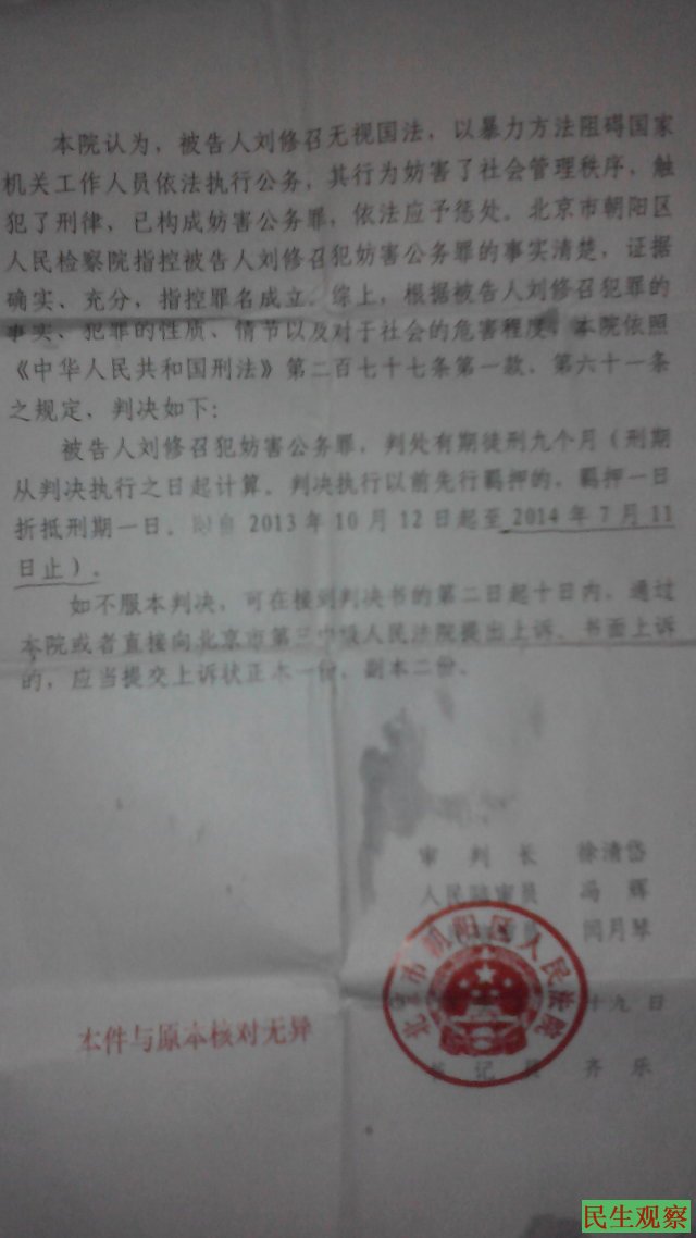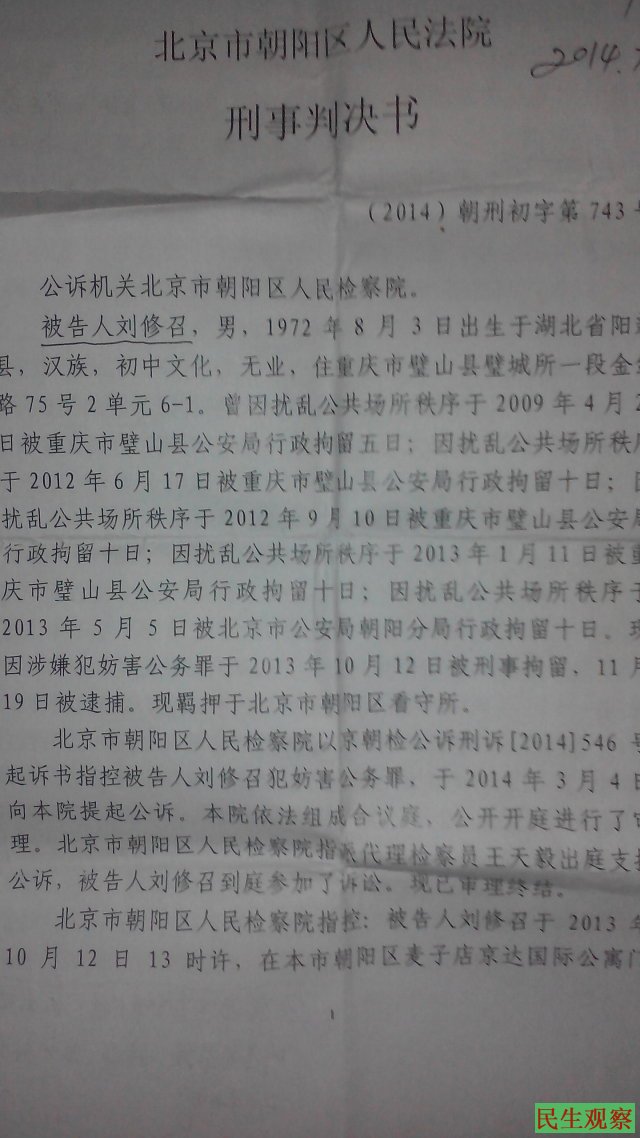 重庆维权上访人刘修召“妨害公务罪”的判决书