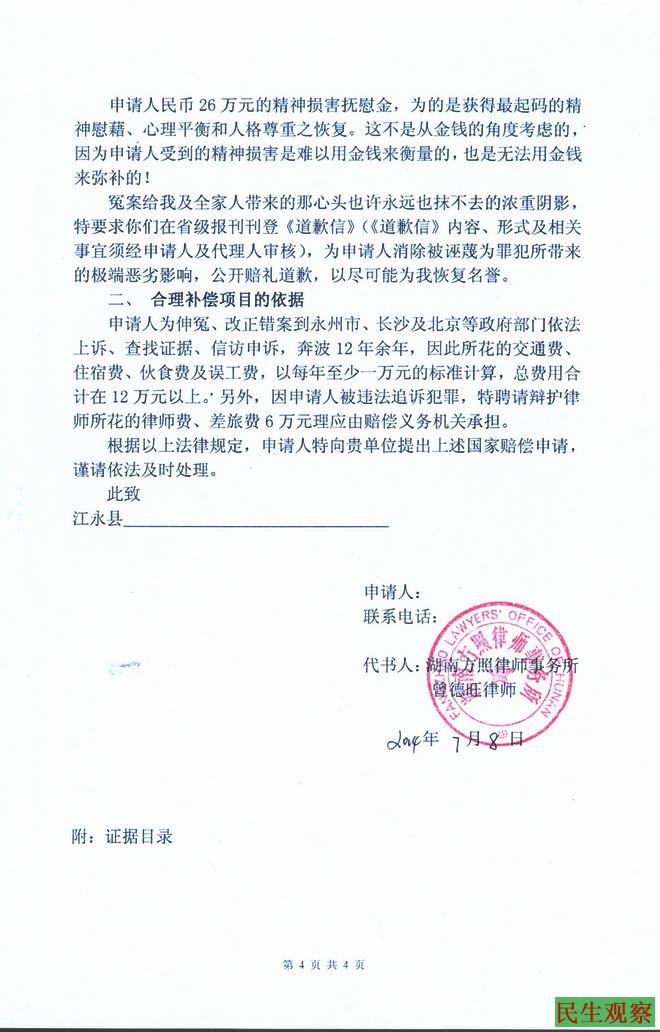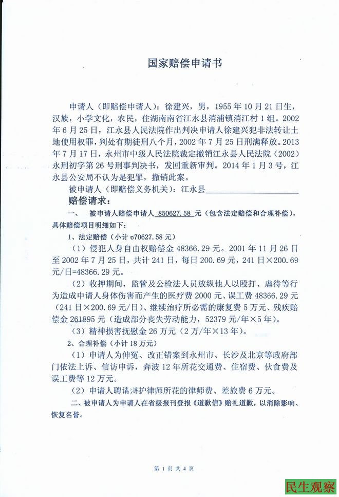湖南省江永县徐建兴申请国家赔偿的事实和理由