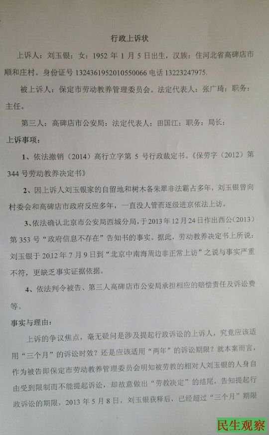 河北高碑店市刘玉银状告保定市劳教委
