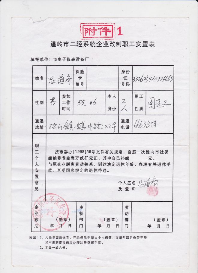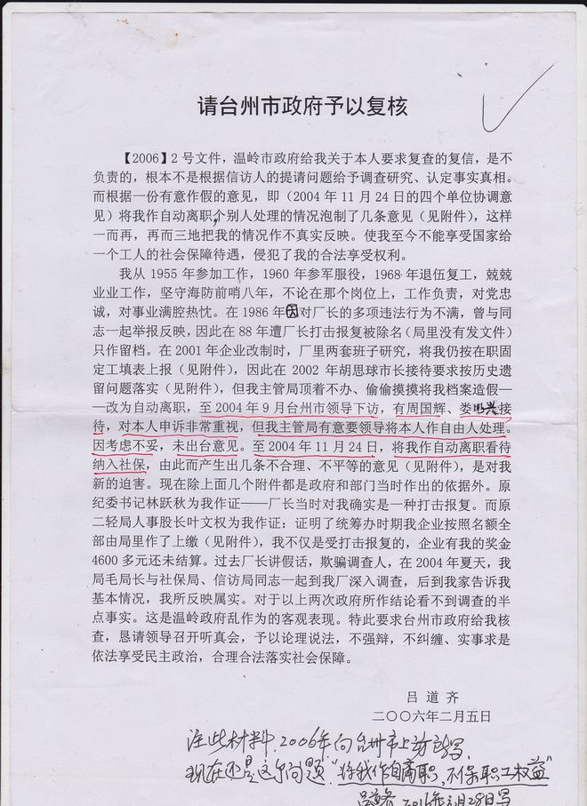 浙江温岭二轻老职工吕道齐就因举报被辞退的申诉信