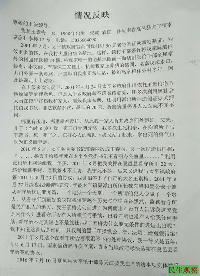 河南省夏邑县农民王素梅讨要宅基地十多年无果