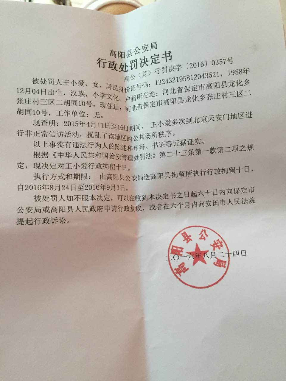 民生观察工作室2016/8/24消息:河北省保定市高阳县龙化乡张庄村村民王小爱,今天被高阳县公安局以扰乱公共执行为由决定拘留10天,因血压太高被免于执行。