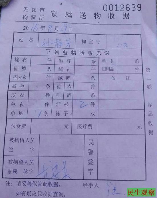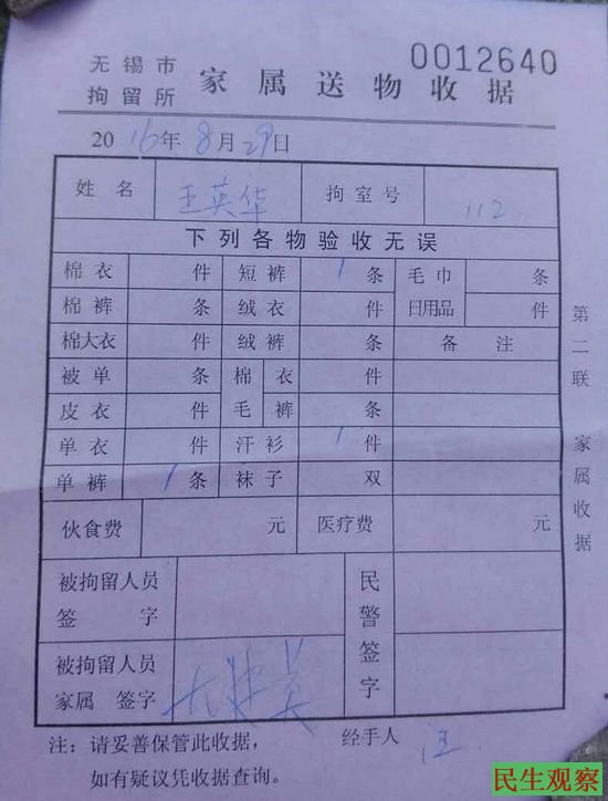 此外,江苏无锡访民尤建英告诉本网志愿者,无锡市惠山区访民王英华昨天被从福建的女儿家绑架回来拘留了,拘留期限是10天。 今天去给她存了钱和衣物。也给昨天早一些时候被无锡市锡山分局拘留的孙静芳存了钱和衣物。