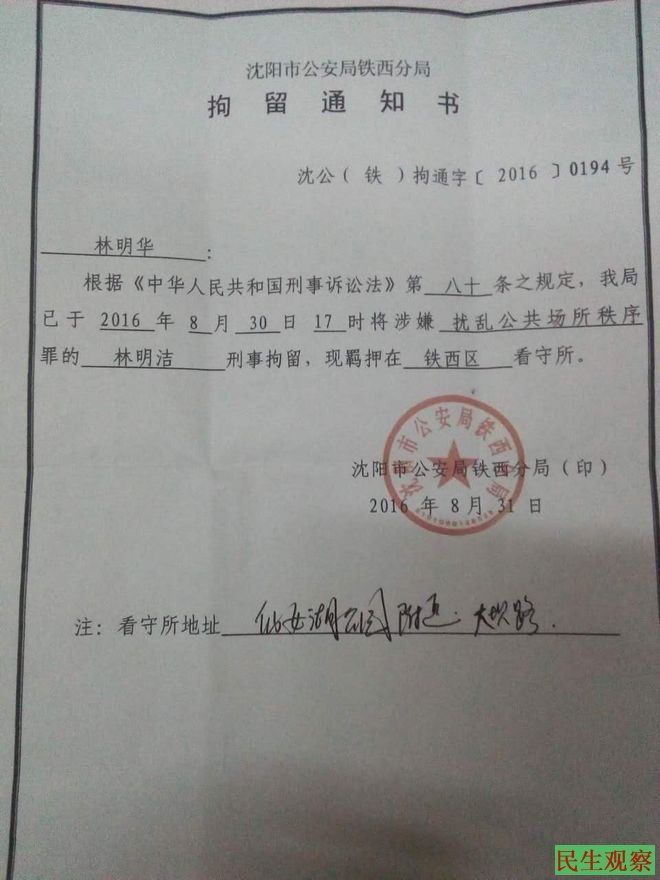 )。林明华说他今天已获得林明洁的刑事拘留通知书,该通知书时间是8月31日,由沈阳市铁西公安分局签发,通知书指林明洁涉嫌扰乱公共场所秩序罪,现关押在铁西区看守所。