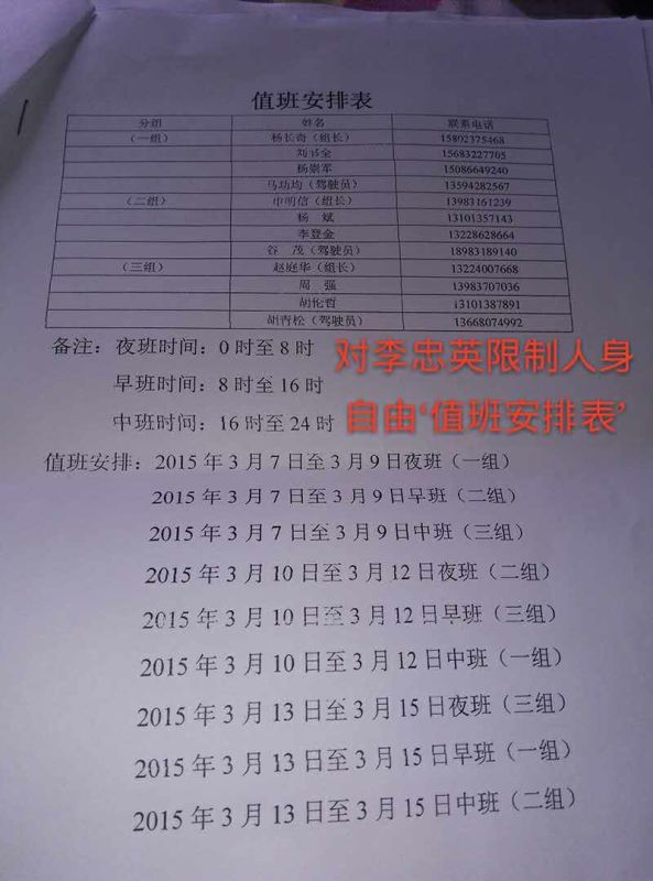李朝惠说,我是2016年9月22日买了一张去北京的火车票,9月23日,八桥镇政法委书记刘义贵就指使不明身份的人来监视我,每班6人,每天两班共12人,每人每天225元“工钱”。昨天我想出去,又被10几个人强行拉上警车送回家。和我同镇的李忠英(13996288462)和我同样的“待遇”,每天12人看着,蒋邦全(18223061231)也是每天10几个人看着。我电话是(13640513512)
