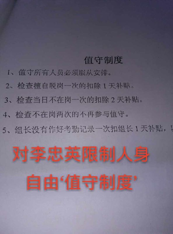 随后本网志愿者联系到李忠英,她说,自2015年6月起,重庆市大渡口区八桥镇政法委书记刘义贵(15902392528)雇用社会闲杂人员把我看起来,至今没有自由。和看李朝惠的人数和手段都是一样的,多者每天二、三十人,少者每天十一人,其中八桥派出所协勤3人,不准我出门,我现在被限制自由已经超过一年了。日常用品我们出钱他们去买,有时候也让我老公去买。他们还在我租住房的屋前屋后搭棚三间,二十四小时不间断监视和限制我的人身自由至今,这种无法无天迫害我的行为,至今没人来管。