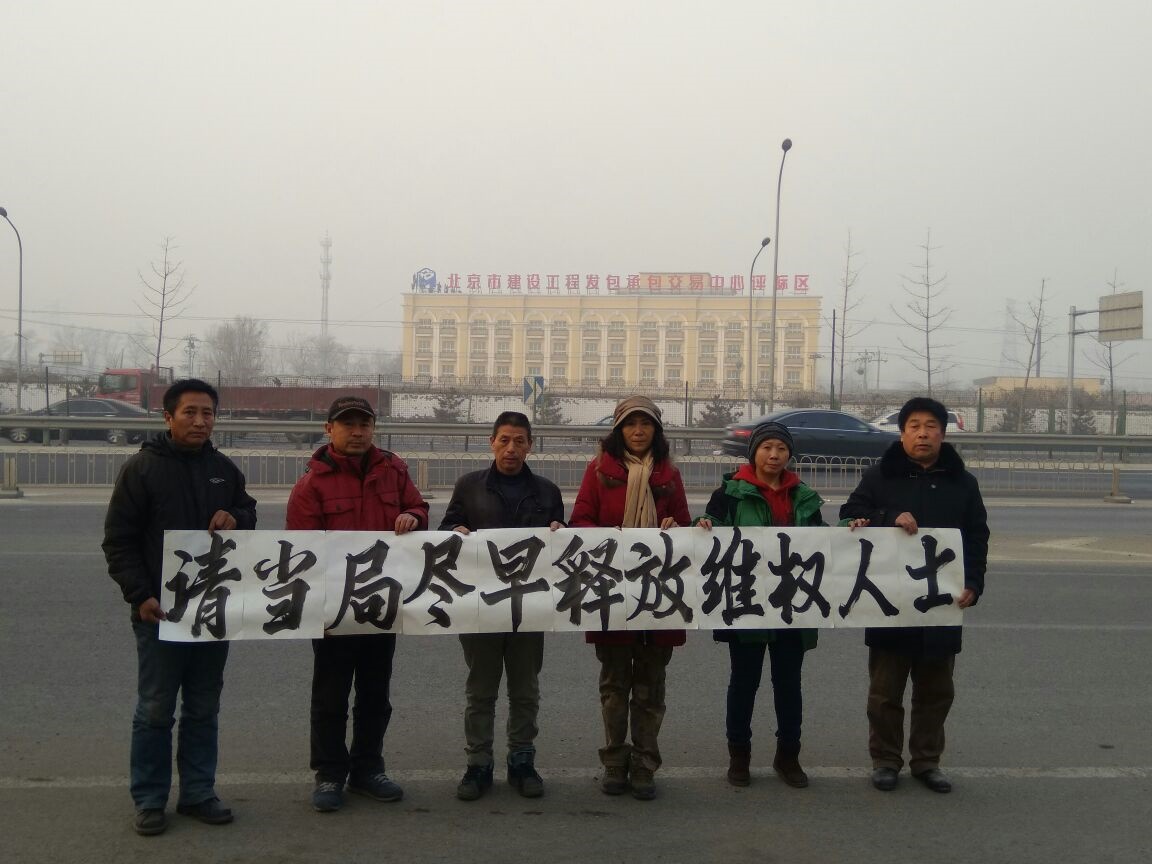 [访民之声2017/1/2消息] 日前,祝忠孝、季新华等在京访民张打横幅,要求当局立即释放民生观察刘飞跃及所有维权人士,及早实现民主、法治、宪政。