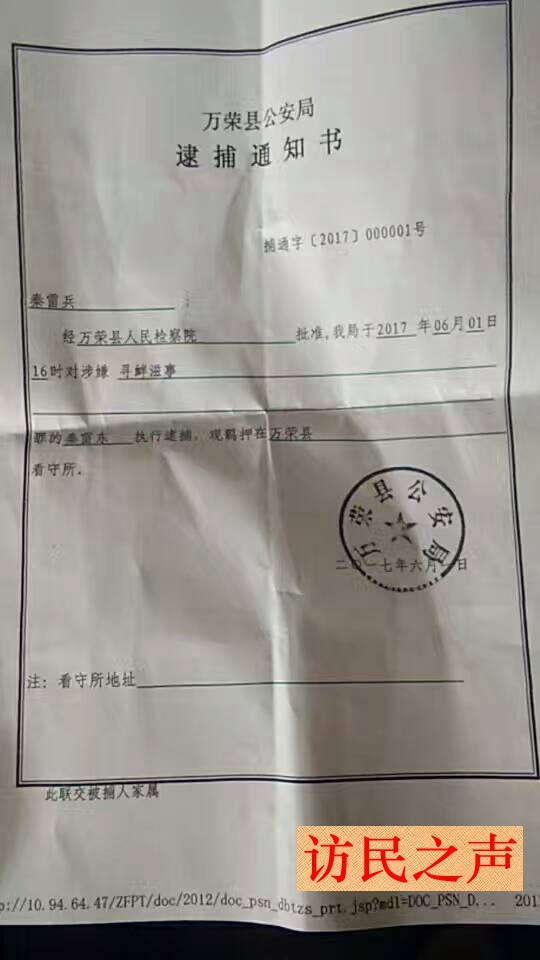 相关报道:山西万荣县访民秦雷东被以涉嫌寻衅滋事罪刑拘