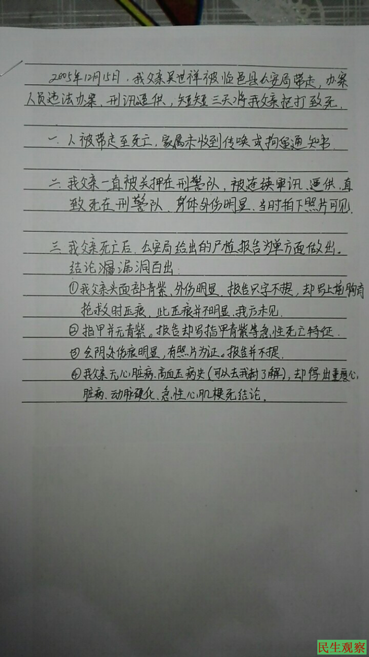 2005年12月15日我父亲吴世祥被临邑县公安局带走,办案人员违法办案,刑讯逼供,短短三天将我父亲殴打折磨致死。