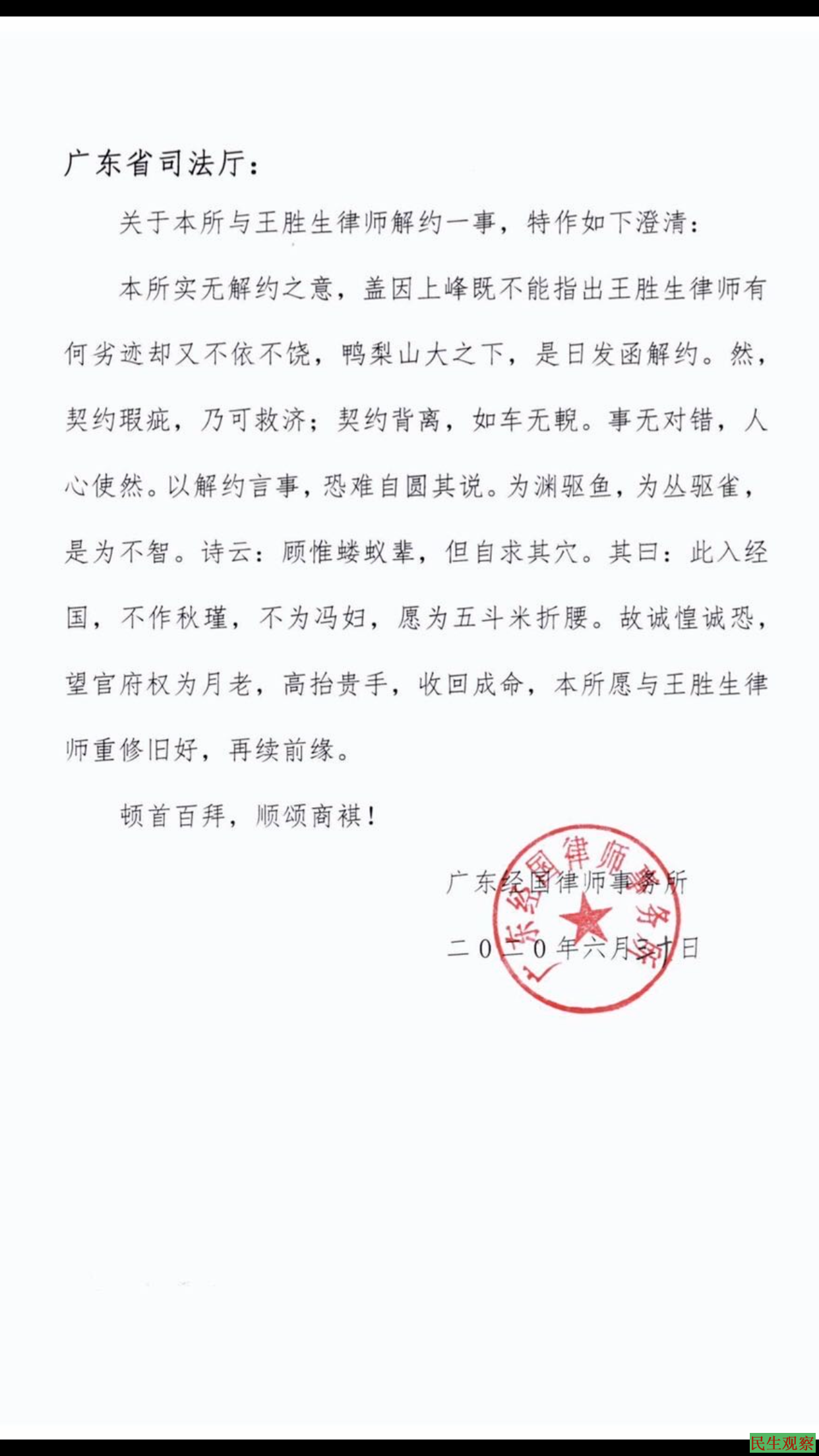 广州市司法局的何友汉、桂海波担心自己因此受责,就在2020年7月2日晚连夜电话经国所的每一位管委会成员,且又把李兴厚主任叫去做最后的威逼。于是胆战心惊回来的李兴厚主任就和经国所的管委们商定,被迫连夜发文说假话做所谓的“澄清”,称律所单方解约没有受到过逼迫,说是何伟民律师起草的公函所述不实,盖章未经同意。