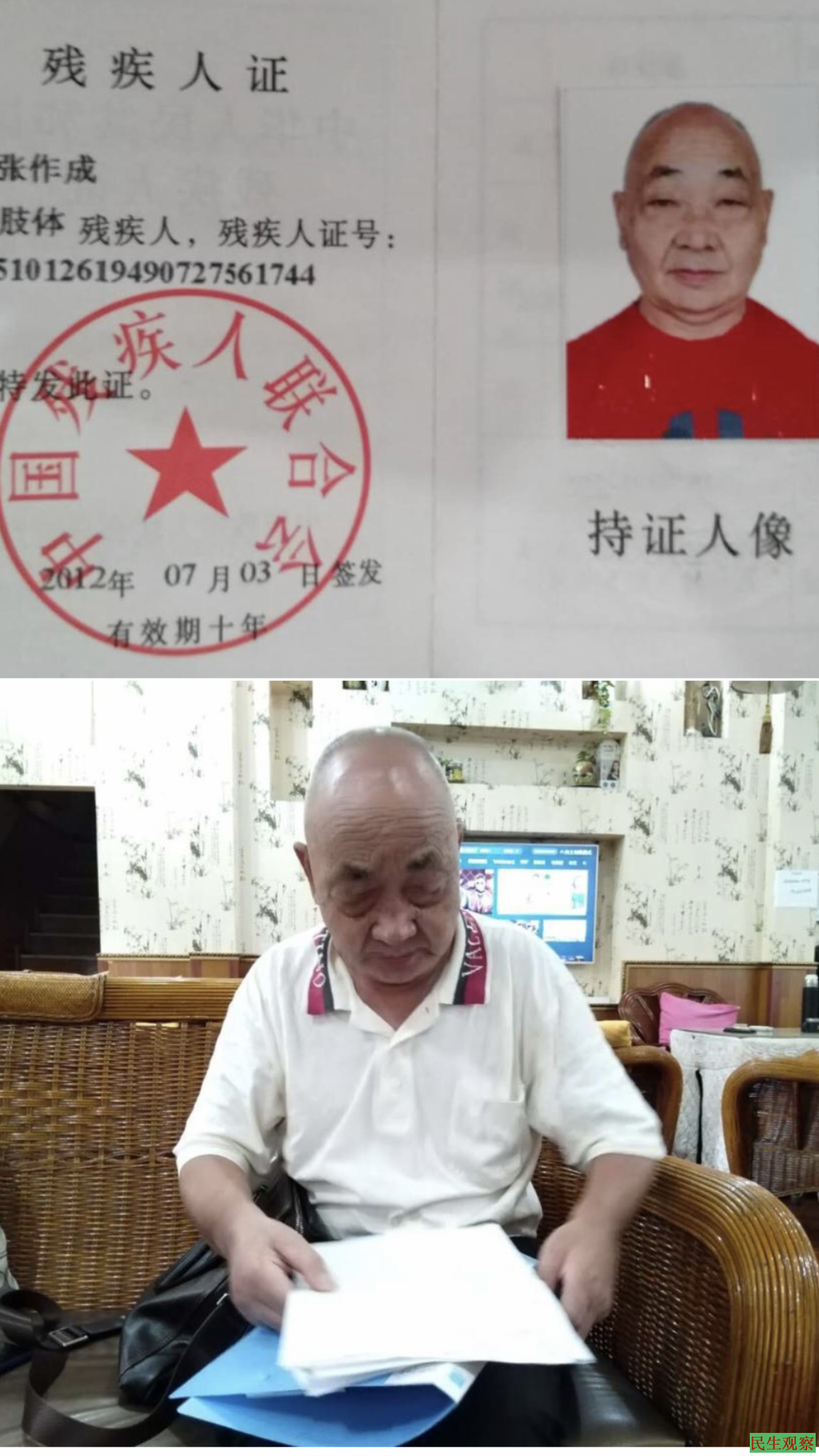 2005年,成都彭州市年已不惑的张作成,变卖了城里所有可以变现的物品,凭借热情和一技之长,来到出生地天彭镇八一村,建起了一家大型养猪场。然而天有不测风云,张作成不顾年龄和身体事无巨细亲力亲为,一次工伤导致股骨折,造成三级残障后果。2012年获得国家肢体残疾证51012619490727561744。此后,更让张作成没想到的是,猪场和家境出现崩溃式挫折。租赁的农田面临工业化征用拆迁,至此开始拖着残疾的身体向权贵、向违约者,讨要自己应该得到的利益和尊严。不过事与愿违,经历和遭遇的都是比给他残障更加痛苦的人生经历。