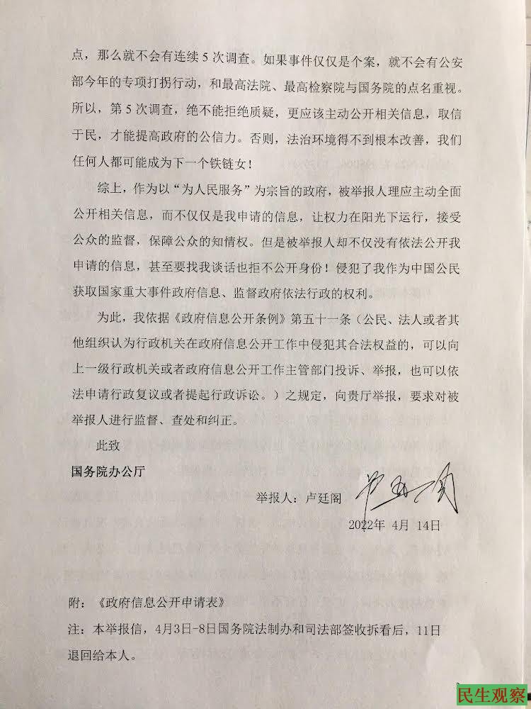 注:本举报信,4月3日一8日国务院法制办和司法部签收拆看后,11日退回给本人。