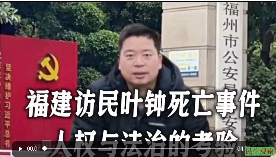 (四)叶钟,福建省福州市晋安区鼓山镇访民,硕士学历,妻子患白血病,因房子被强拆,未得到安置补偿,各部门投诉无果后成了访民。2023年9月12日中午,与访民在福州市仓山区建某酒店一起吃饭时,在没有任何违法行为下,被当地警察带走后失联。一个星期后,叶钟患白血病妻子李美英也失踪。10月16日,在福建几个维权群疯传叶钟被鼓山派出所抓走后被活活打死的消息。