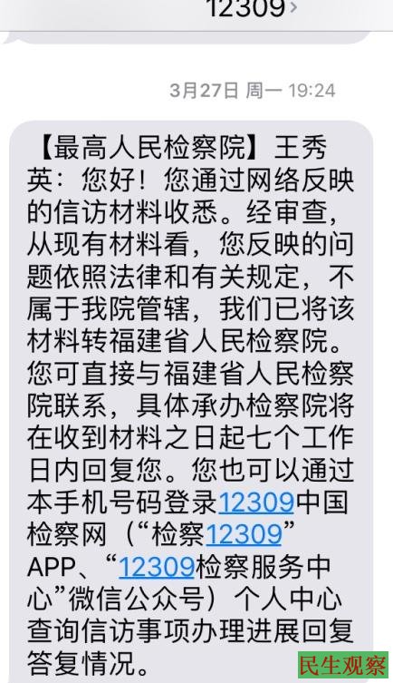 当天晚上(5月10日)23点27分收到福建省检察院12309的短信如下: