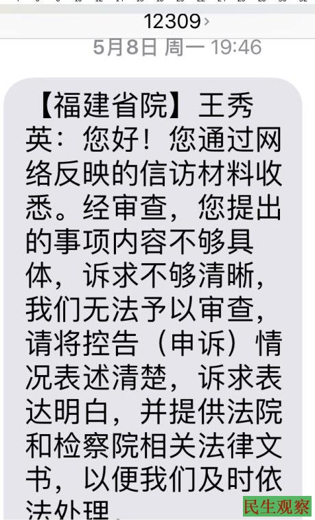 举报人收到该短信40多天,一直也没有收到福建省人民检察院的回复,因2009年举报人到福建省人民检察院申诉,他们看终审法院是福建省人民法院坚决不受理,因此,举报人并不再去福建省人民检察院查询。2023年5月8日,举报人收到福建12309的一条短信,内容如下: