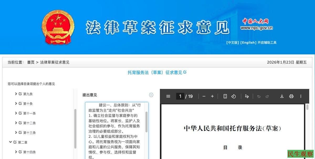 2026年1月23日,现居美国的中国女律师陆妙卿向全国人大常委会提交《关于〈托育服务法(草案)〉的修改建议》,呼吁在立法中强化社会监督与家庭参与机制,尤其是通过确立家长委员会的独立地位,弥补托育服务中过度依赖行政监管的制度缺陷,更有效地预防侵害婴幼儿权益的行为。