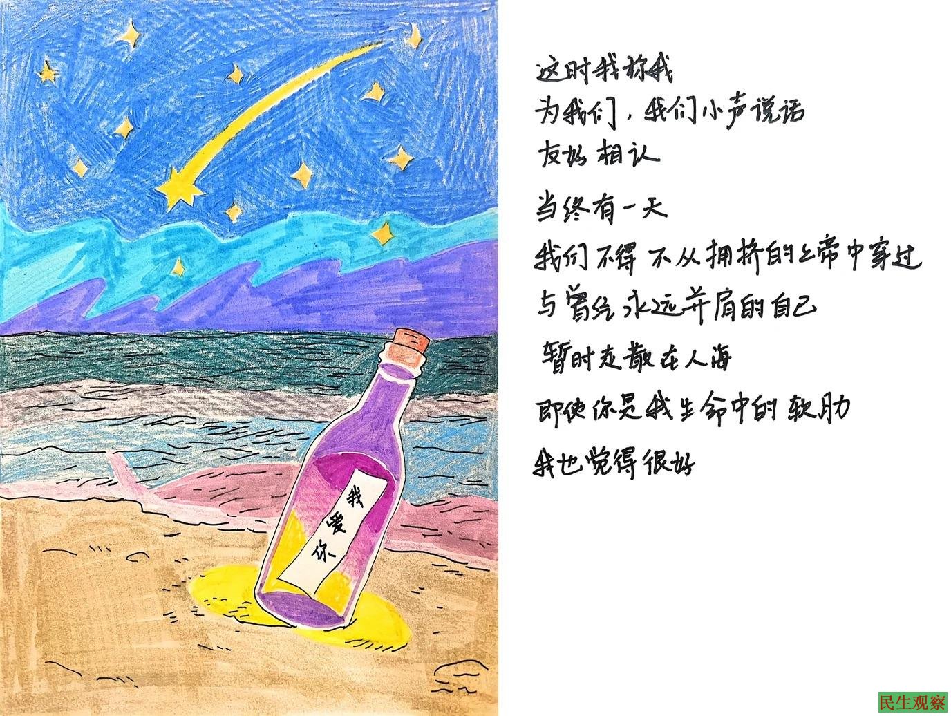 信里他说,让我替他抬头看看天上的星辰。于是我在1月30日回信时,特意画了一张手绘的流星、海边和许愿瓶,把我觉得最美的星空呈现给他。也许他此时还没有收到这封信,也不知道这封信能否顺利到达他手中。