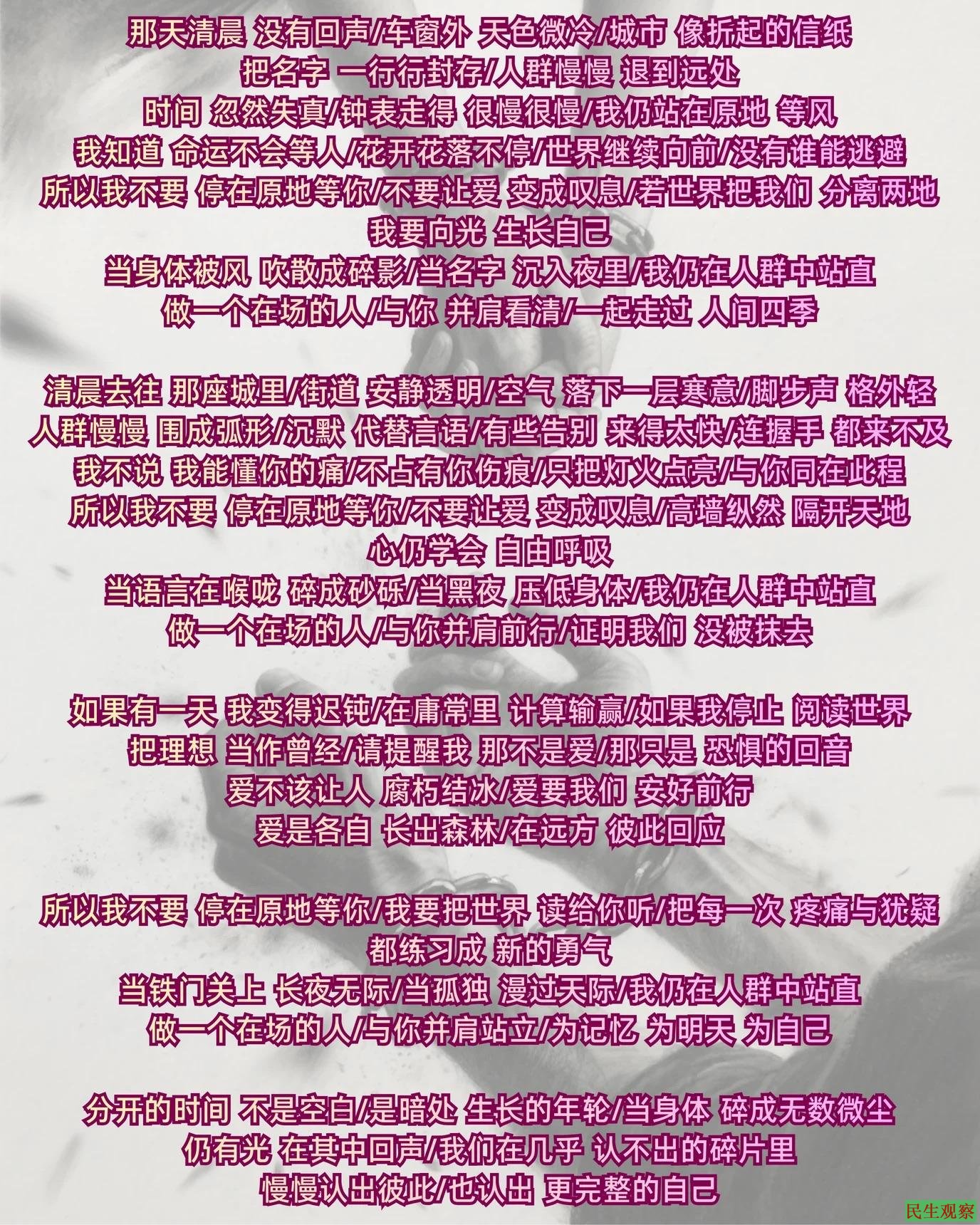 在分开的时间里,你将经历的改变,和我将经历的改变,都无法预知。所以我们什么都无法预言和承诺。如果我呆滞而且迂腐了;如果我在庸俗化的评价体系里变相向社会讨债了;如果我不再怀抱着对生命热切的好奇和梦想;如果我变得自大,停留在原地,不再阅读与吸收新的知识,不再学习如何更积极地以行动关心我所存在的世界……