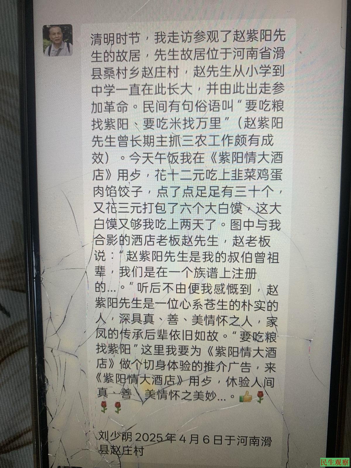4.8日,他朋友陈先生从了解赵庄村情况的朋友处了解,说赵庄村“紫阳先生故居”被封,不让人参观。4.6日,刘先生发微信没有告诉,他欲参观“紫阳故居”被拒,这样陈先生再反过来向刘少明先生求证。结果,陈先生才知道以上情况。