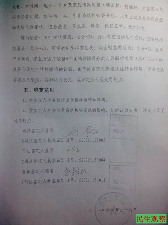 以下是李金兰的鉴定书和采访视频: