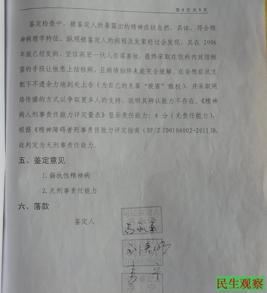 2013年9月,在他被凤凰市公安局刑拘期间给他做过一份精神病鉴定,鉴定意见书中这样描述“纵观被鉴定人的病程及发案经过会发现其在2006年就已经发病,坚信高宏一伙人在谋害他,最终采取在饮料内放结核菌的手段让他患上结核病,且病情始终未能完全缓解。在妄想症状支配下不遗余力到处上告(为自己的无辜被害维权),并采取网上传播的方式争取更多人的支持,说明其辨认能力不存在。”鉴定结果为“偏执性精神病,无刑事责任能力。之后便把他送进精神病院“治疗”三次。