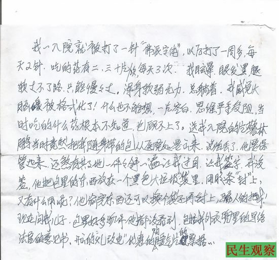 在医院探视时得知她向医院递交过出院申请,得到的对待就是递交一次先打针一次,院方的答复还说分局特别吩咐,别人都可以由家属接出院,唯独她不行。要听公安局的,一定要等警察的通知。王丽荣也和儿子一起办理过一次出院手续,遭到了拒绝。