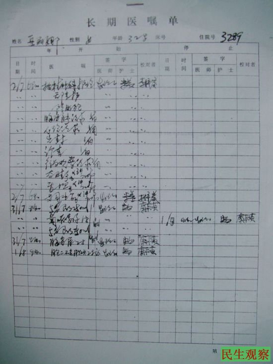 另外,2012年6月在我去北京不久,我父母及有病的哥哥怕我出事也去了北京,乡政府也是强行把他们带回,他们不但把我父亲岳怀民非法拘禁在乡政府的一间小房子内,而且还对一个体弱多病的老人殴打辱骂,之后又用同样的方式将我父亲强行带到新乡第二附属精神病院,开始把他带到住院部让他观看精神病人进行恐吓(你不听话就跟他们一样就是精神病),回来后因为我父亲没有按照他们的意思办就又一次把我父亲拳打脚踢强行带到新乡第二附属精神病院进行所谓的“精神病鉴定”,然后在乡政府大院一间小房子里关了一个多月。7月29日,我父亲岳怀民被从乡政府带到南乐精神病院,7月30日一个叫李向(翔)的副院长伙同一帮人强行给我父亲过电、输液,输液后我父亲除与我的症状都一样外,可能是年老体弱的原因增加了手颤抖,走不成路的症状。