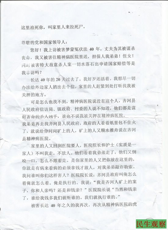 把她送到医院后她就喊,你们不就是为了保护他们贪赃枉法到手的钱财、官职不被查出来才害我的吗?你们还有没有良心?医院院长告诉她是齐河市政府和煤矿保卫科吴科长签的字把你送来的,他们让怎么治我医院就怎么治你。