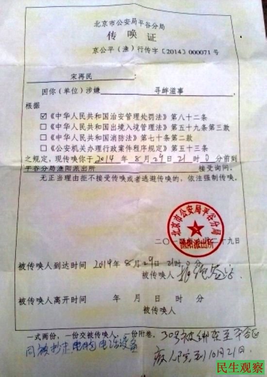 从传唤证上看,北京市公安局平谷分局是根据治安管理处罚法第82条,以涉嫌寻衅滋事传唤的宋再民,也就是说,宋再民面临的将是治安或刑事处罚。而他辖区派出所却在把宋再民关押一晚后,于8月30日晚强制把宋再民送到了平谷精神病院。宋再民声明我是政治行为,承担政治后果,你拘留、逮捕、判刑都行,你们把我送到这来第一我没病,第二你们没有征得我和我家属许可,你们这是对我的绑架和非法拘禁。警方并没理会,坚持要执行上级命令,还是把他绑架到了平谷精神病院(北京市平谷区金海湖镇社区卫生服务中心医院)。