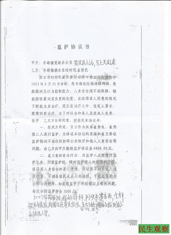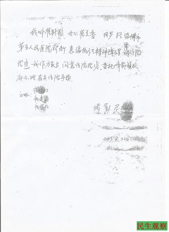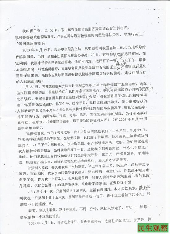 崔兰香说” 在敬老院关押期间,我并未见任何精神病专家,也未有相关资质的医师给我做精神鉴定,村书记崔林江用车把我父亲拉到大队办公室,说我有偏执性精神障碍症,还对我父亲说你又没钱 给她治疗,你签个字、摁个手印,我们给她治疗,就这样在父亲未见到我的前提下被他们蒙骗签字,而村书记、村长、会计还做了证明人。”