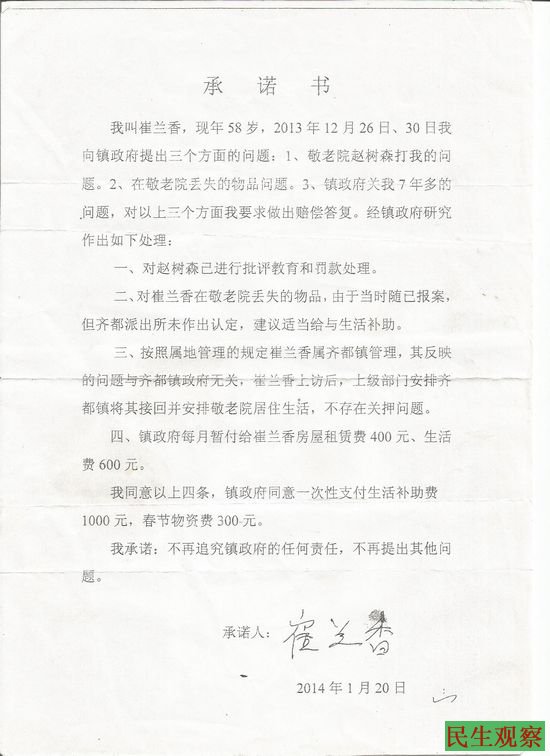 2014年1月20日,由于对生活的无奈和上访的绝望,崔兰香跟镇政府签署了承诺书,双方均有签字,承诺书最后一条写明:我不在追究镇政府的任何责任,不再提出其他问题。而政府赔偿的只是每月少的不能再少的补助罢了。