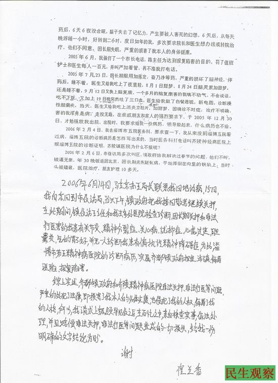 8月22日,齐都镇政府拿着一张淄博市第五人民医院的诊断书,对崔兰香的父亲崔新民说她患有偏执性精神病障碍,由时任西古东村会计崔顺江起草了”同意入院治疗委托书” ,并由她父亲签字确认。该委托书说明作为崔兰香的父亲,同意委托齐都镇政府办理有关住院的手续。至此,齐都镇政府拿到了送她进精神病院的这扇大门的钥匙,24日被送入齐陵精神病医院,迫害至此开始。