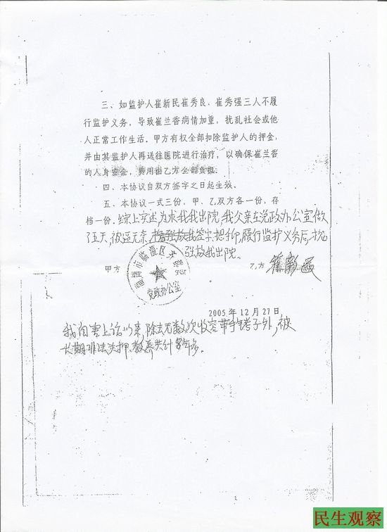 由于病情加重,身体状况非常糟糕,2005年12月27日,由齐都镇党政办公室和崔父签署了一份监护协议书,在签字、按手印、并向政府集纳6000元保证金后,12月30日,崔兰香获得了自由,后来她才知道,父亲当时为了争取让她出来,在镇政府党政办公室整整坐了5天,这次关押达两年四个月之久。