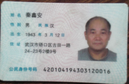 秦鑫安,男,1943年3月12日生人,身份证号420104194303120016。住武汉市硚口区古田一路。今年70岁了。1962年7月参军,1965年参加了援越抗美战争,荣立二等功。